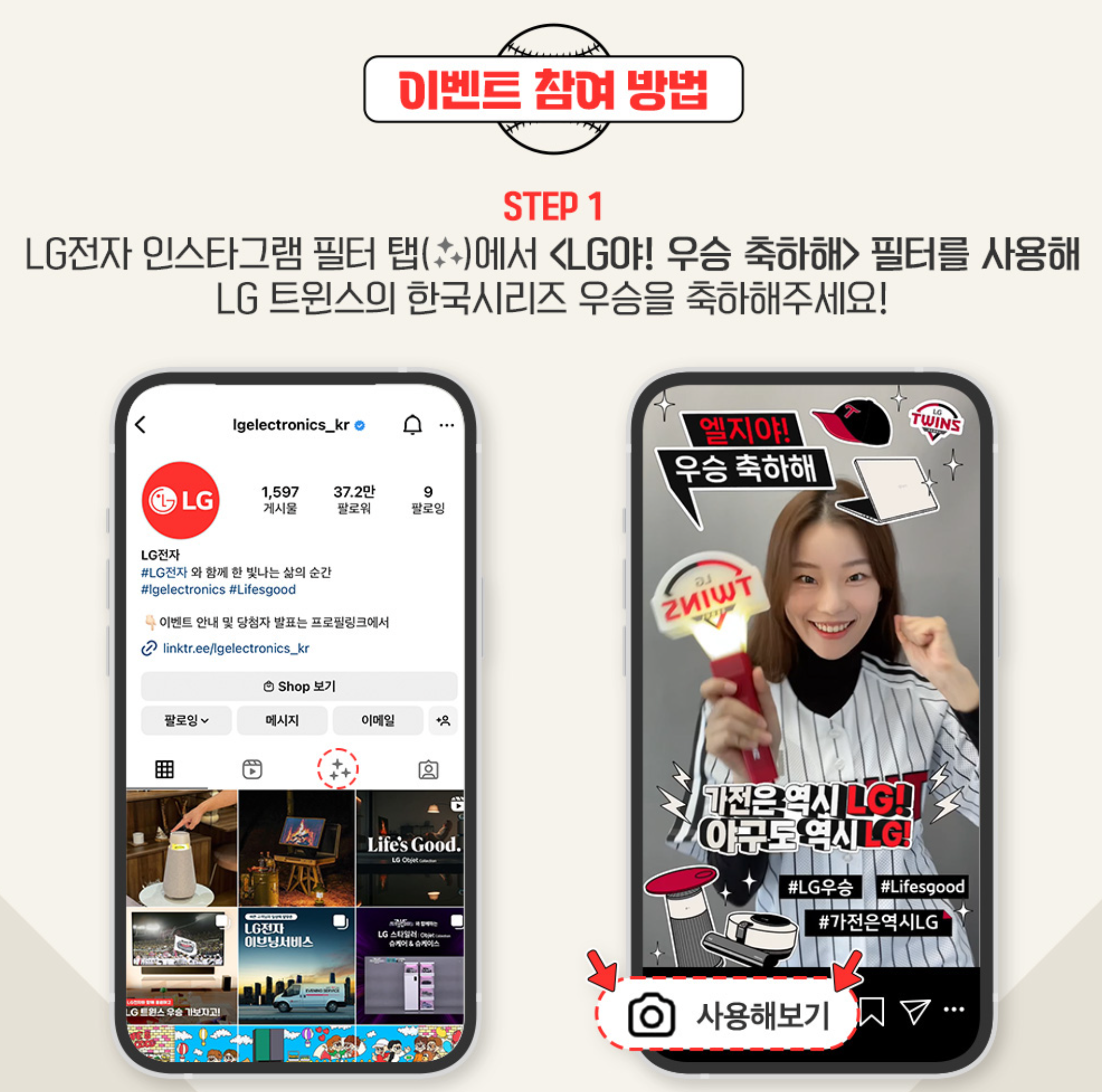 LG전자 인스타그램 프로필에서 필터 탭으로 이동하여 <LG야! 우승 축하해> 필터로 우승을 축하하며 기념 촬영을 합니다.