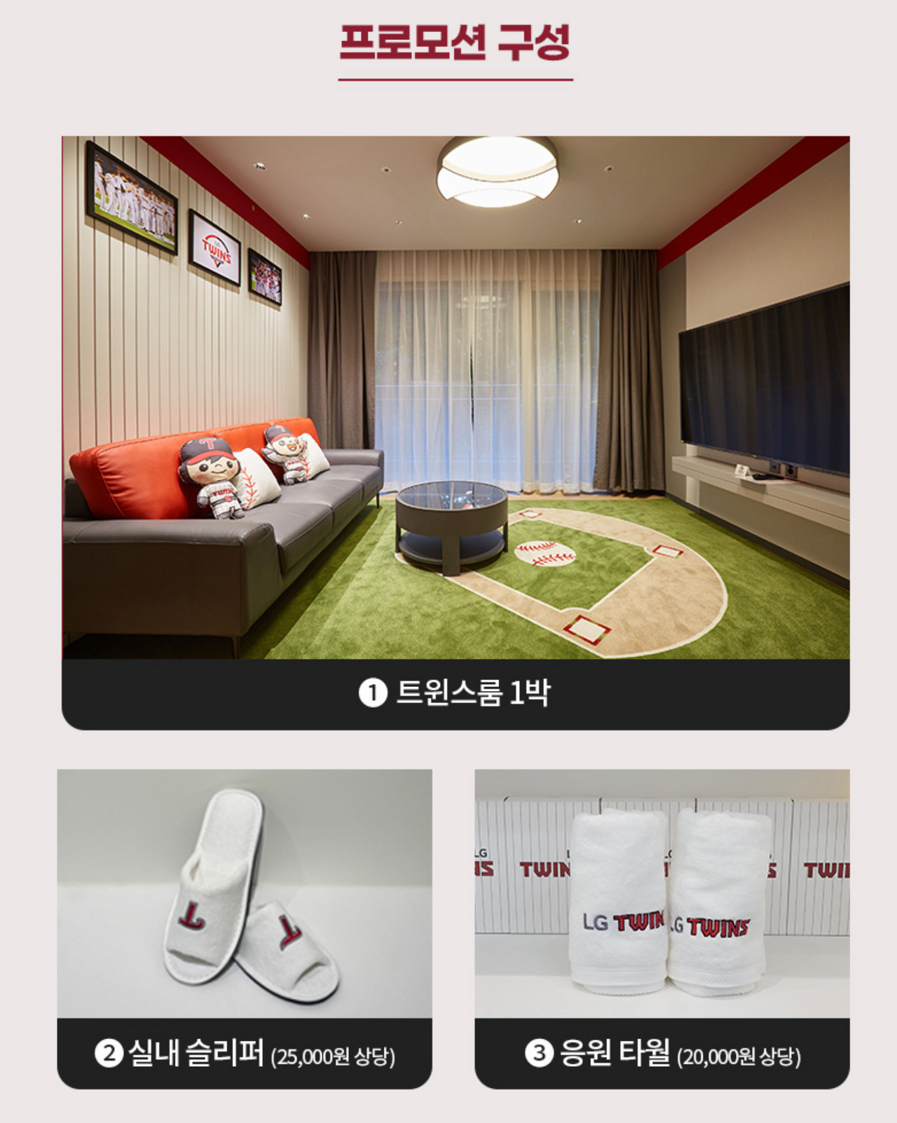 프로모션 구성은 트윈스룸 1박에 추가로 실내슬리퍼, 응원 타월이 증정됩니다.
